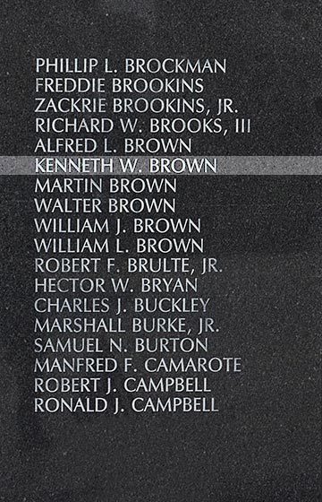 "Kent" Brown enjoyed football, baseball, fencing and choir at Murrell Dobbins Vocational High School. In July 1968, a month after graduating from Dobbins, he enlisted in the Army so his recently-married brother, Samuel, who had been wounded in Vietnam. could come home. Kenneth Brown was sent to Vietnam in October 1969, where the radio equipment repairman and radio operator was assigned to Company C of the 125th Signal Battalion, 25th Infantry Division. Samuel Brown was in a 25th Infantry Division unit stationed nearby. and was among the Last people to see Kenneth Brown alive. The 19-year. old specialist four died on December 2, 1969.
