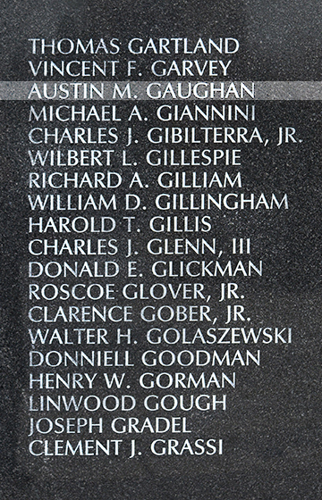 "Aust" Gaughan wanted to join the Marine Corps right out of West Catholic High School in 1966, but his father persuaded him to think about it for a year. Over the next year, he attended Peirce Junior College, clerked at First Pennsylvania Banking and Trust Co. and made regular Saturday morning visits to a Marine recruiting station. Gaughan remained committed to the Marines, and enlisted in July 1967. He trained as a combat engineer and was sent to Vietnam in January 1968. "I'll be a Marine if it kills me," he wrote home from the war. Not wanting to alarm his parents, be told them that he liked his duty post with Company A of the 3rd Shore Patrol Battalion, 3rd Marine Division, at Khe Sahn, Quang Tri Province, and was getting plenty of sleep. After his parents saw a Life magazine article that painted a far grimmer picture of Khe Sahn, Gaughan admitted that life was rough there. The 19-year-old private first class died on March 15, 1968, in the Station Hospital in Da Nang, of wounds sustained in Khe Sanh the previous day. He was survived by his parents.