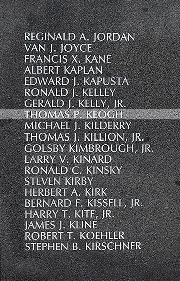 "Tommy" Keogh never held back his laughter. He reveled in card playing and slapstick routines, and would repeat anything funny he heard on television to anyone who would listen. He enlisted in the Army in 1954 at the age of 17 and spent a year and a half in Germany. Three tours of duty in Vietnam followed for the aircraft maintenance repairman, the last with the 146th Aviation Company of the 224th Aviation Battalion. Keogh died in a truck accident on July 7, 1972. The 24-year-old staff sergeant died before he could see his newborn daughter. He was survived by his wife, two daughters, mother, a brother who served with the Special Forces in Vietnam, and two sisters.