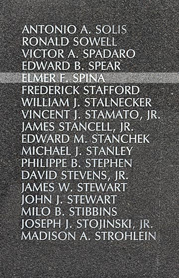 "He was a big, handsome kid, six-foot-two, 200 pounds. He loved cars," recalled a sister of the 1955 South Philadelphia High School graduate. Spina enlisted in the Army in the fall of 1965. The 20-year-old private first class, a rifleman, was assigned to Company C of the 2nd Battalion, 28th Infantry, 1st Infantry Division, in Vietnam. He died on Jan, 2, 1967, when the reconnaisance party for which he had volunteered came under fire. Survivors included his parents and two sisters,